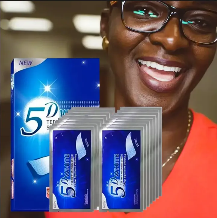 شرائط تبييض الأسنان **5D Whitening Teeth Strips** صُممت لإزالة التصبّغات الصفراء والعنيدة عن سطح الأسنان ومنح ابتسامة أكثر بياضًا في مدة قصيرة. تركيبتها الفعّالة تلتصق جيدًا بالأسنان، سهلة الاستخدام في المنزل، ولطيفة على المينا بحيث لا تسبّب تهيّجًا مزعجًا عند الالتزام بمدة الاستخدام الموصى بها.